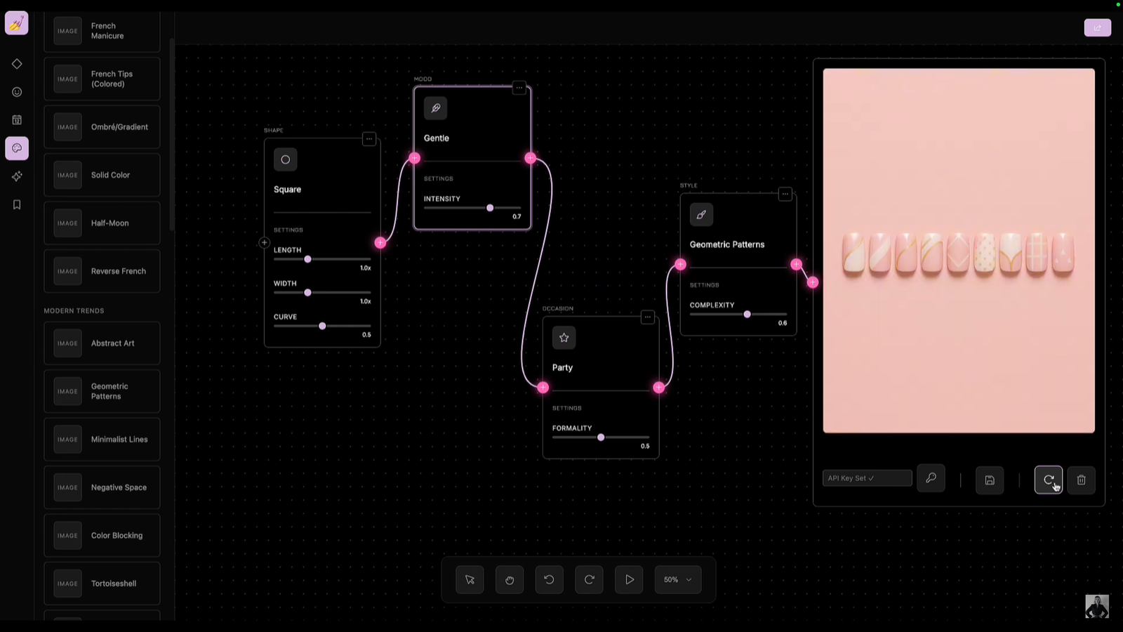 "Imagine if nail design worked the way you prototype an app. That’s what the Nails Constructor Tool delivers—a node-based system that turns creativity into a workflow. Instead of static templates, you build from the ground up by combining: