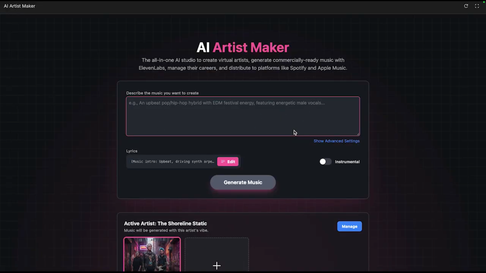 "AI Artist Maker is a full-stack creative platform built to empower musicians and creators to produce, brand, and publish AI-generated music at a professional level. The tool goes beyond composition by offering artist creation, visual asset generation, and direct publishing support for streaming platforms."