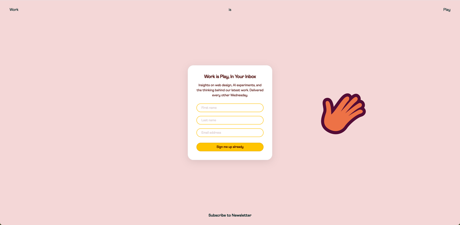 "A weirdly fun and nostalgic DVD-screensaver-turned-newsletter sign-up page. The Work is Play hand floats around your screen like the old DVD logo, bouncing off the edges—with a few surprises along the way. Clicking on the jiggling Play word, you can tweak speed, scale, turn on Sicko Mode™ and Zero Gravity Mode®. It’s a playful little way to subscribe to our newsletter. Nothing serious. Just fun."